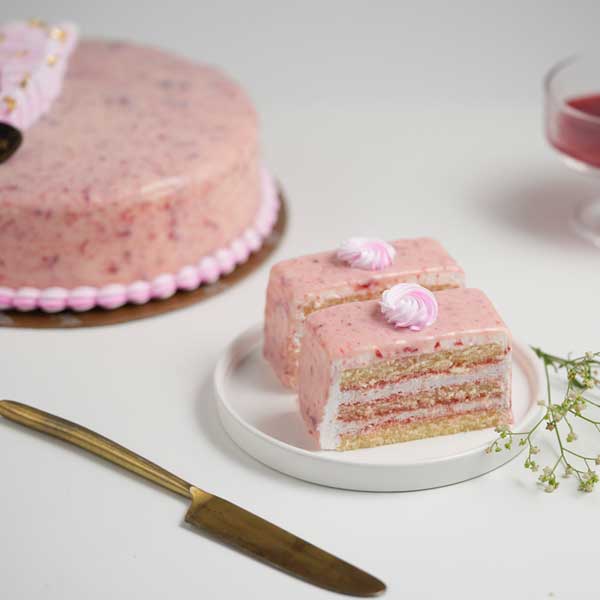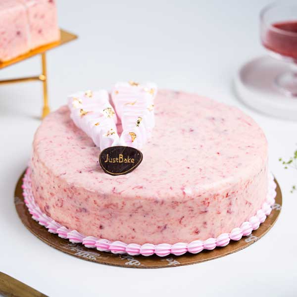 English Strawberry Cake from Just Bake is a delightful confection that captures the essence of fresh strawberries in every bite. This exquisite cake features layers of light, fluffy sponge cake, each imbued with the sweet, tangy flavour of ripe strawberries. The cake is generously filled and frosted with a creamy, strawberry-infused icing that enhances the fruity experience, creating a perfect balance of flavours.