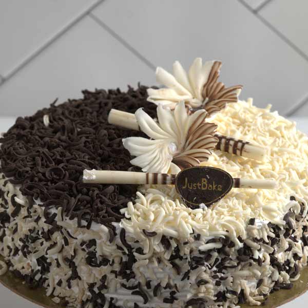 The Duet Cake (White and Black Forest) from Just Bake is a spectacular fusion of flavours that harmoniously combines the richness of Black Forest with the delicate sweetness of White Forest. This exquisite cake features alternating layers of moist, chocolatey Black Forest sponge and light, creamy White Forest sponge. The Black Forest layers are generously filled with rich chocolate ganache, cherries, and a hint of kirsch, offering a delightful burst of flavour with every bite. The White Forest layers are equally tantalising, with smooth vanilla cream and fresh fruit that adds a refreshing contrast.