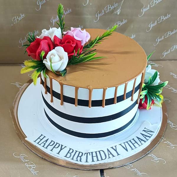 Elevate your celebrations with our Gold Drip Black and White Stripe Cake. This striking masterpiece features elegant black and white stripes adorned with a luxurious golden drip that adds a touch of glamour. Perfect for any occasion, its rich, moist layers and smooth, creamy frosting make it a delicious delight. Celebrate in style with this chic and sophisticated cake from Just Bake, where every slice is a taste of indulgence.
