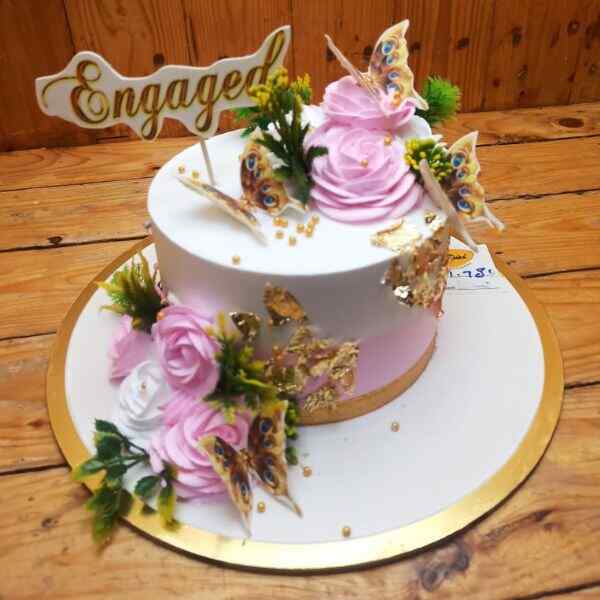 This beautifully crafted engagement cake exudes elegance and romance. Decorated with delicate pink and white rosettes, lifelike golden butterflies, sprigs of fresh greenery, and edible gold leaf accents, it captures the magic of a special commitment. The soft pastel tones paired with the shimmering gold give it a luxurious touch, while the “Engaged” topper makes it the perfect centerpiece for your celebration.